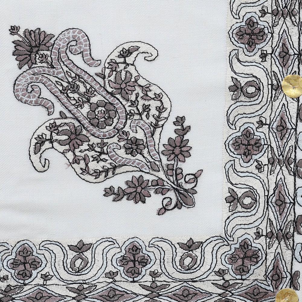 شال ترمه شتوي من صوف الكشمير 100%، يتميز بجوهرته الفاخرة التي تجمع بين الخفة والدفء في نفس الوقت. يأتي الشال بلون أرضي سكري هادئ يناسب جميع الإطلالات الشتوية، مع لمسة من التطريز المميز الذي يجسد أناقة التفاصيل. تم اختيار ألوان التطريز بعناية، حيث يمتزج اللون الفضي مع اللون البني الفاتح ليخلق تأثيراً جذاباً وفريداً من نوعه.